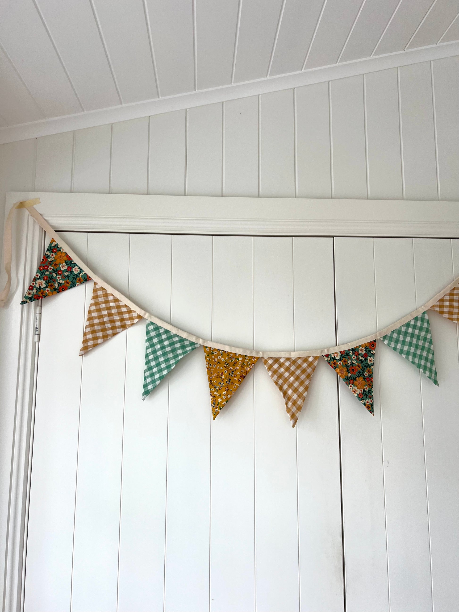 This bunting features two cute floral prints on organic cotton fabric, a mustard yellow gingham linen fabric and a green gingham linen.