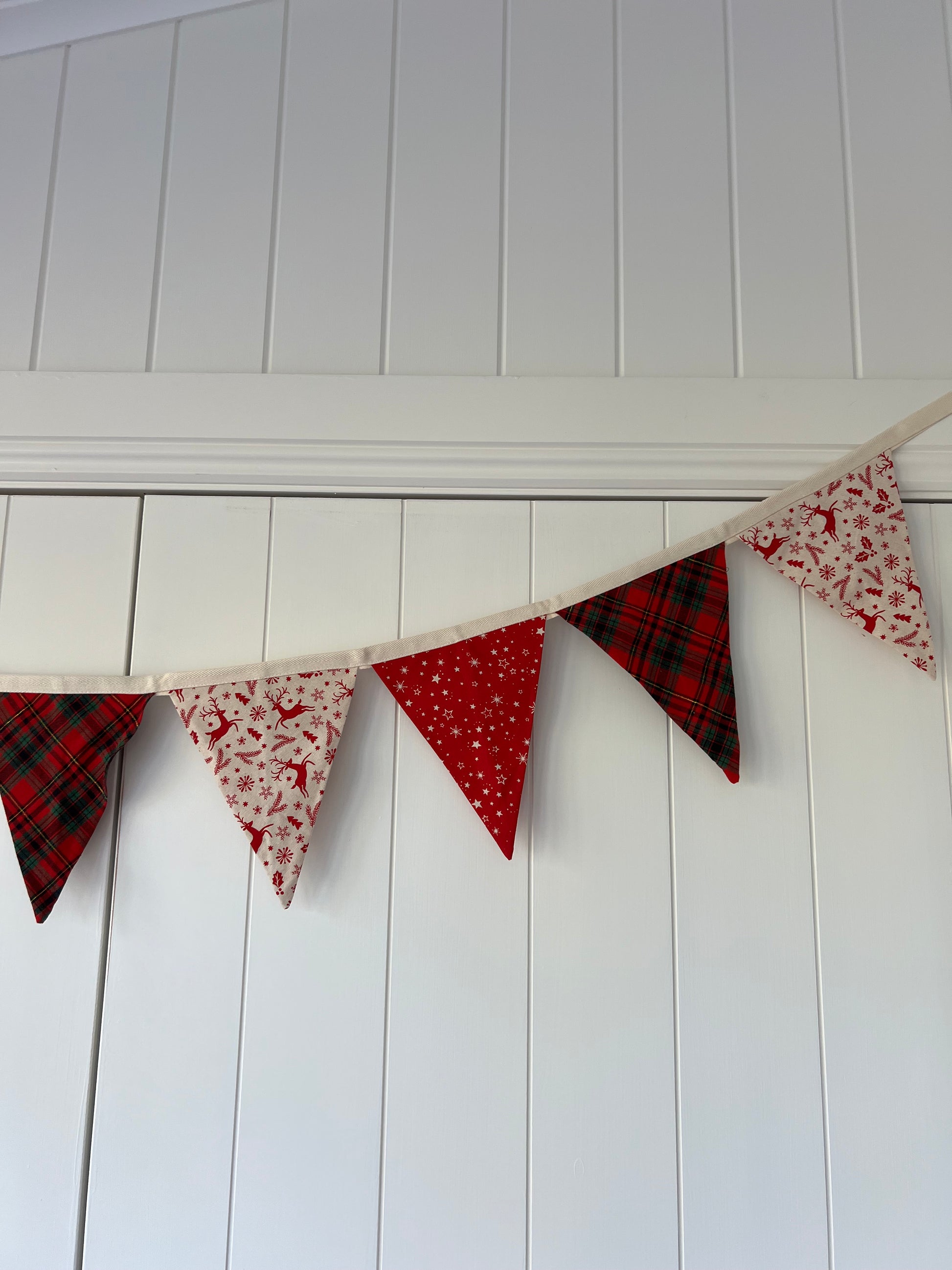 Handmade festive bunting to hang every year at Christmas time. This bunting features a cream coloured cotton bunting string with 3 different alternating Christmas fabrics.
