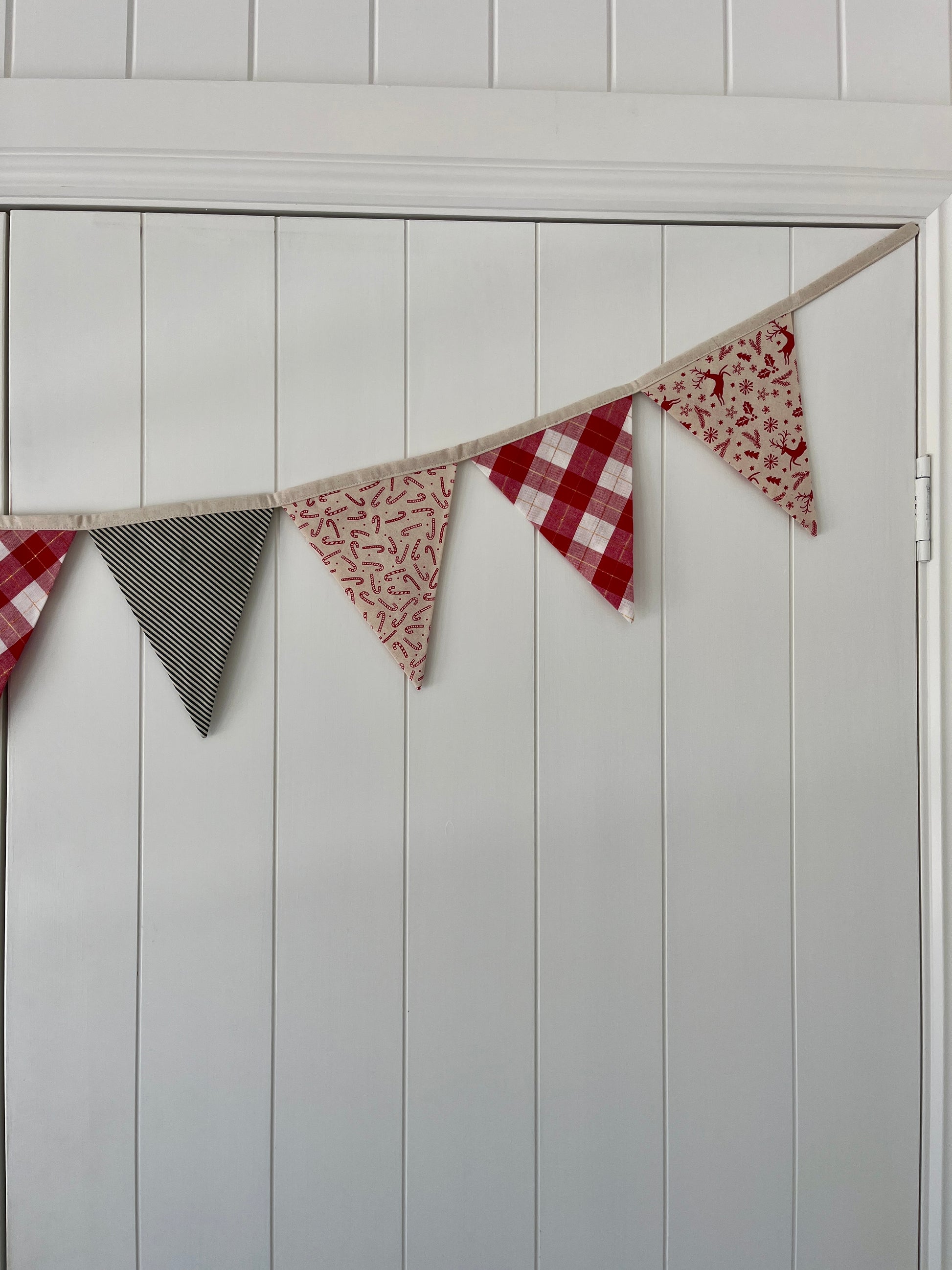 Handmade festive bunting to hang every year at Christmas time. This bunting features 6 different cotton Christmas fabrics & tartans, alternating.