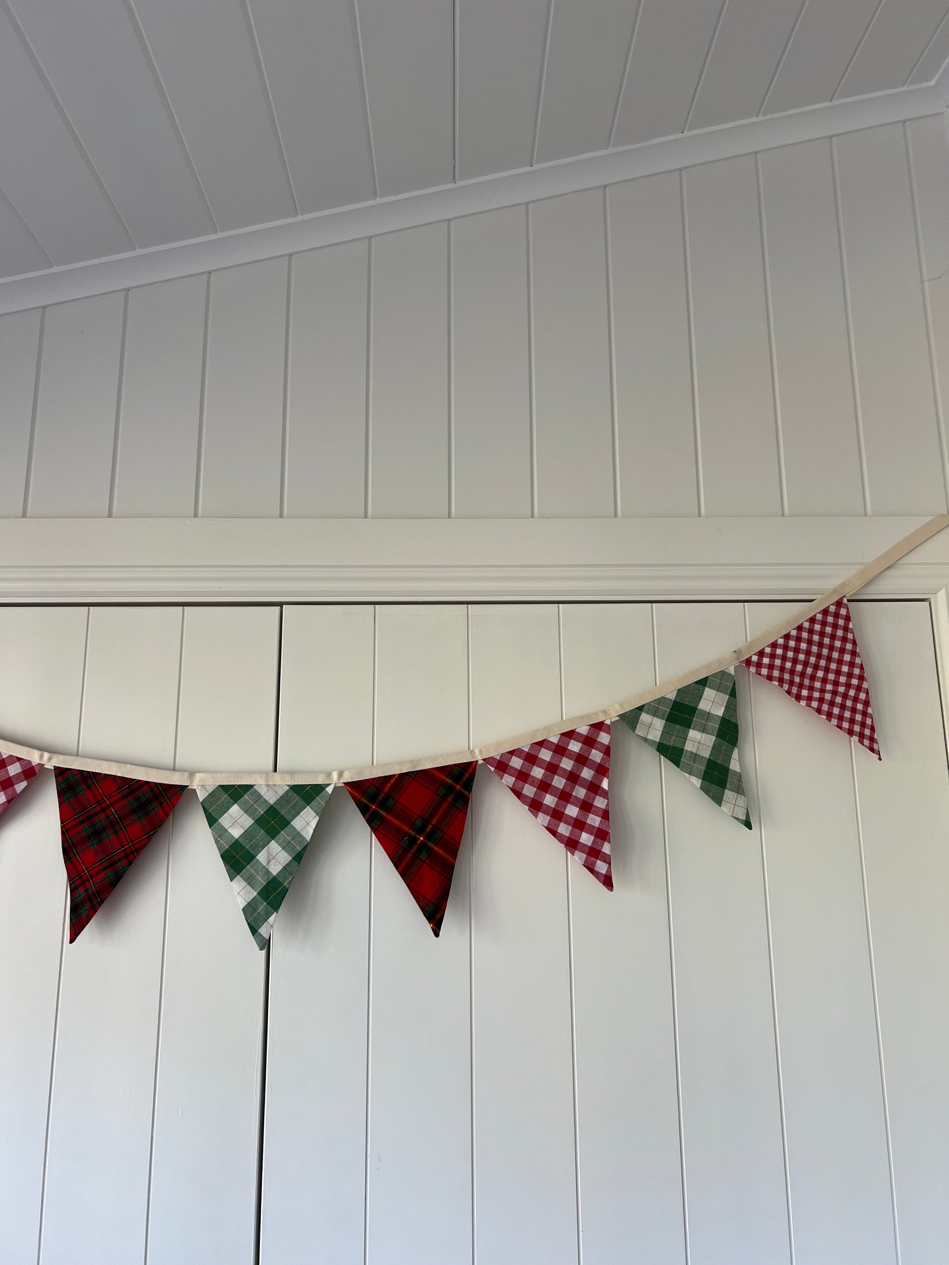 Handmade festive bunting to hang every year at Christmas time. This bunting features a mix of different gingham & tartan fabrics in green and red colours.